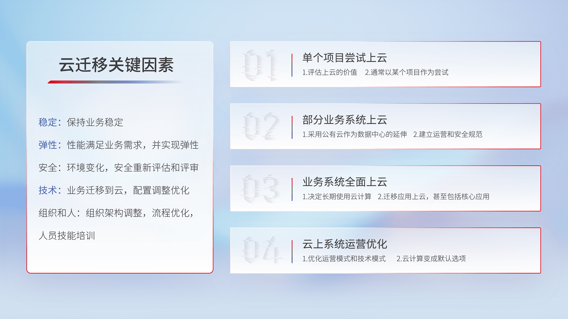 结合实际业务,,,,从规划设计、、、云平台选型、、云原生改造、、、数据迁移、、集成交付,,,迁移全过程为客户识别最佳上云路径,,,,做好风险识别管理,,,,设计网络架构、、、身份权限、、安全审计合规、、、操作审计、、、、日志审计、、监控告警策略、、、多站点容灾设计等,,,,对云上基础设施进行整体规划,,,,提升IT治理水平,,,,以满足弹性、、、高可用、、、高性能的需求。。。。