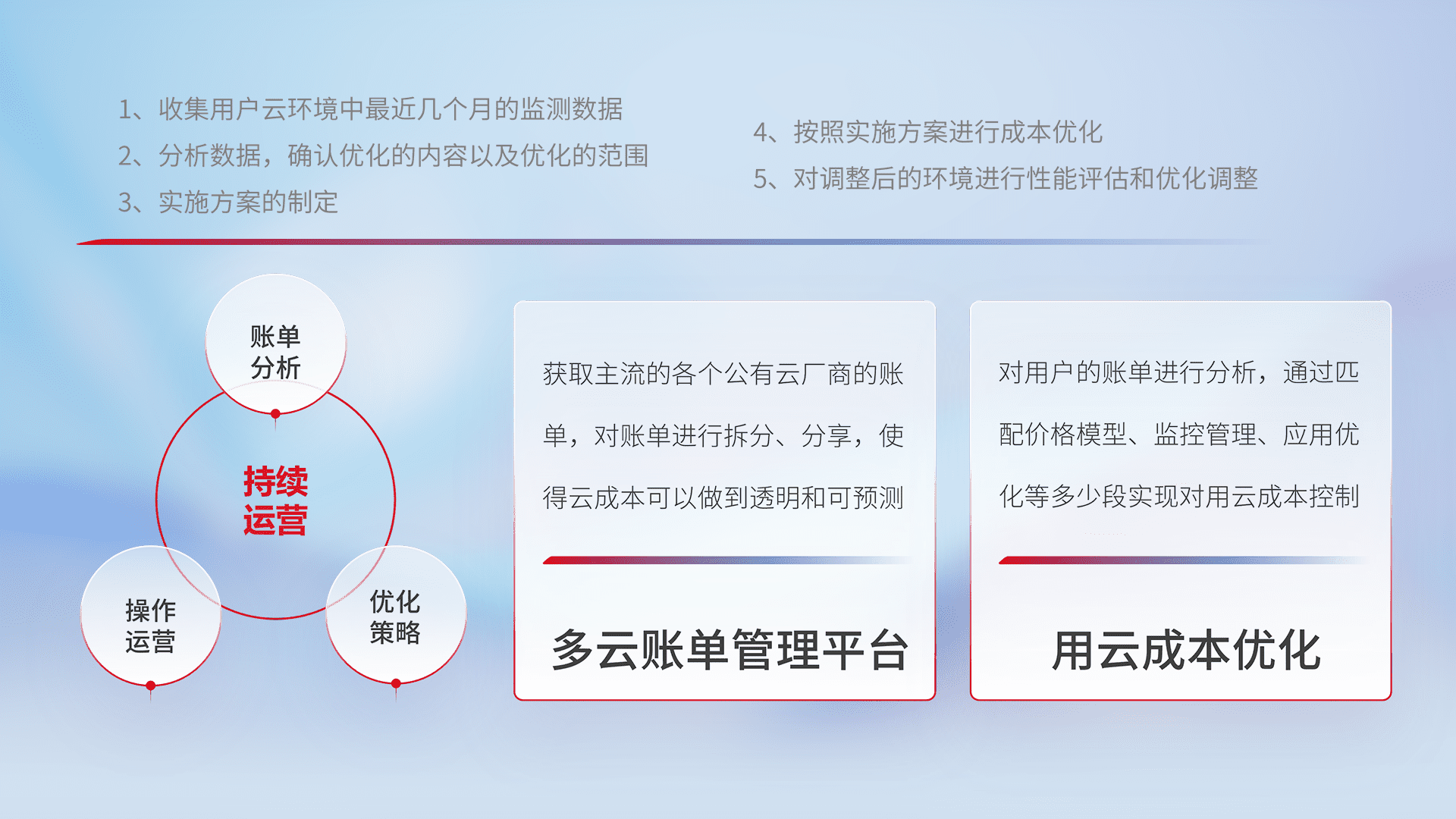 通过多云纳管,,,,以统一的资源数据模型把客户的云资源进行抽象和封装,,进而实现对多云资源的统一操作,,,,保障云资源管理的可靠性、、稳定性与可用性。。量身定制化运维内容,,,,配置、、、开发运维、、、、补丁管理、、、备份、、、、监控、、、认证和访问管理、、审计和日常巡检等,,,保障在用云过程中的可靠度,,,稳定度以及高可用率。。。