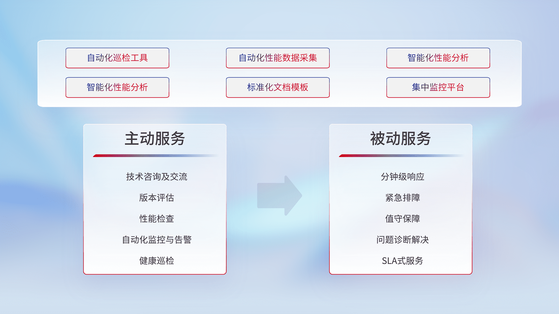 智能化工具和标准化文档,,,,保障服务质量,,,提供主动服务(包含技术咨询、、、版本评估、、、性能检查、、、自动化监控与告警、、、健康巡检)和被动服务包含(分钟级响应、、紧急排障、、、值守保障、、、问题诊断解决、、、SLA服务)。。。。